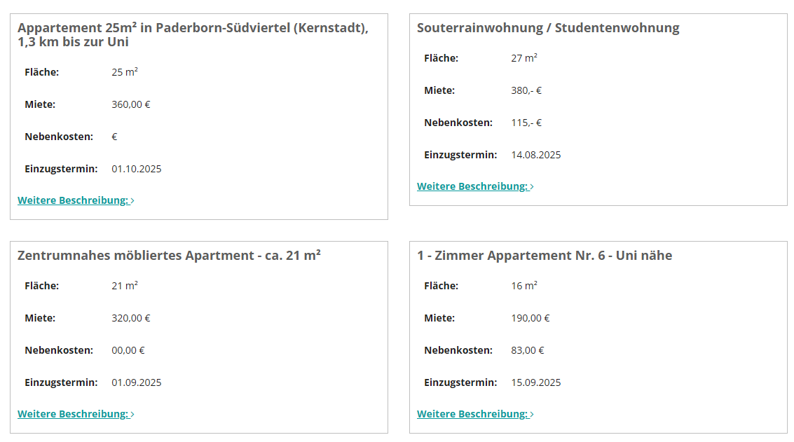 Schau dir hier die privaten Wohnangebote an! Private Vermieter*innen aus Paderborn, Hamm und Lippstadt haben hier die Möglichkeit ihre freien Zimmer oder Wohnungen für Studierende zu annoncieren.